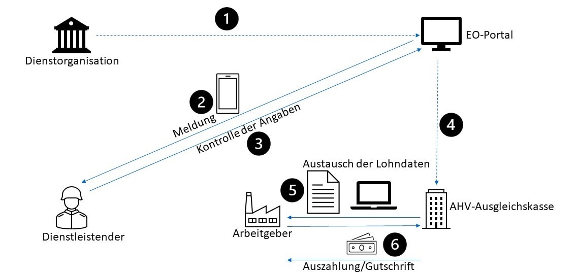 Die Ausgleichskasse berechnet den Erwerbsausfall und löst die Zahlung oder Gutschrift an den Arbeitgeber oder den Dienstleistenden aus.